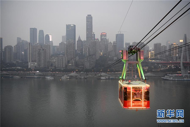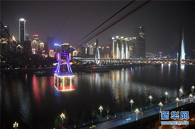 12月23日,“長(zhǎng)江索道”在重慶夜空中運(yùn)行。新華社記者 唐奕 攝