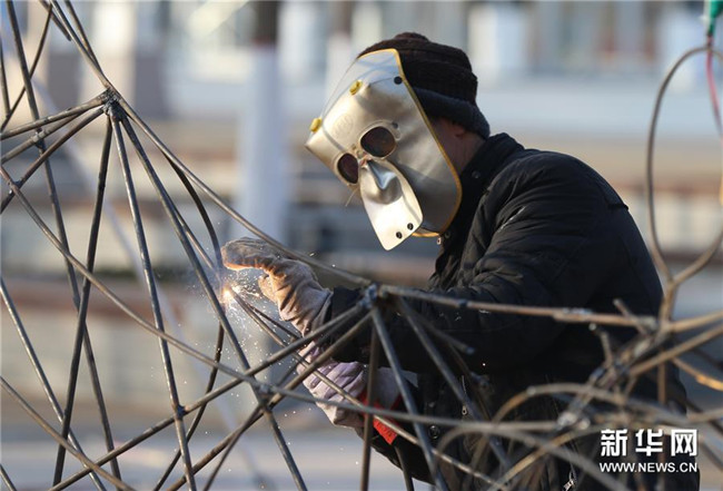 12月24日,工作人員在銀川花博園內制作花燈。新華社記者 賈浩成 攝