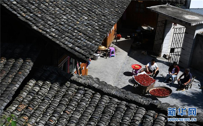 貴州省石阡縣坪山鄉(xiāng)大坪村監(jiān)委會(huì)主任左艷(左一)與下地勞作歸來(lái)的村民交談(2018年8月29日攝)。新華社記者 楊文斌 攝