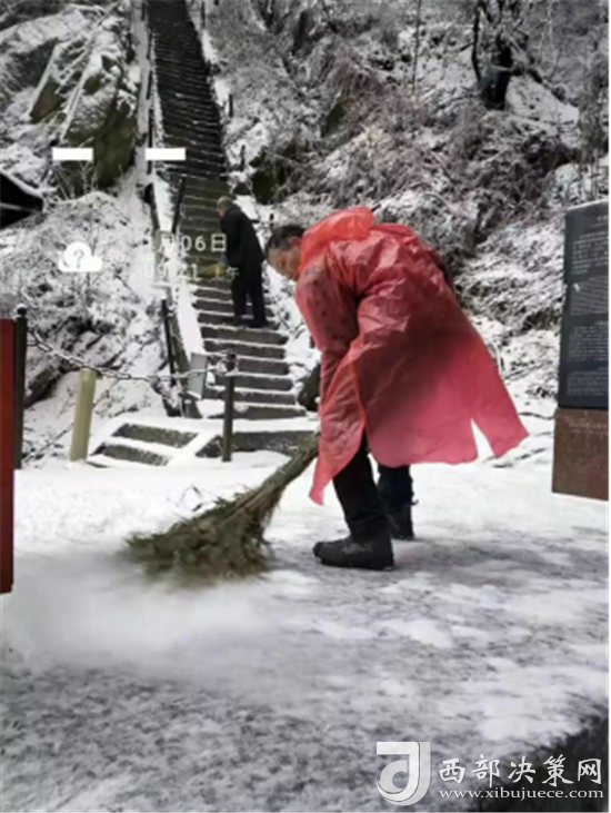 連續(xù)的降雪使景區(qū)內(nèi)積雪最深達(dá)10公分,在欣賞到美景的同時,為確保降雪期間景區(qū)游覽安全和旅游秩序,管理公司一線全體員工從降雪開始一直到7日,冒著嚴(yán)寒對景區(qū)山上主要道路積雪進(jìn)行清掃,確保及時恢復(fù)道路暢通,為游客安全游覽做好保障。