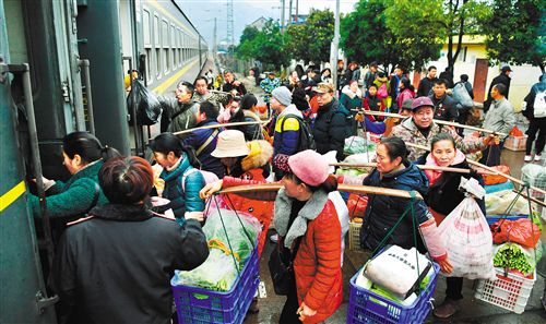 ▲??吭诤鲜÷殛?yáng)郭公坪站的7272次列車,當(dāng)?shù)毓r(nóng)菜農(nóng)挑著擔(dān)子準(zhǔn)備上車。這趟“慢火車”所經(jīng)過(guò)的地區(qū)多為“老少邊窮”,經(jīng)濟(jì)欠發(fā)達(dá)。為盤活沿途百姓致富渠道,鐵路部門開(kāi)“綠燈”允許乘客攜帶大量鮮活貨物乘車。