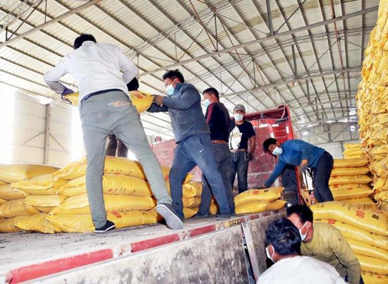 西藏農(nóng)投集團(tuán)化肥倉庫現(xiàn)有庫存2萬多噸化肥,工人們正在忙碌搬運(yùn)。西藏日報(bào)記者 姚海全 攝
