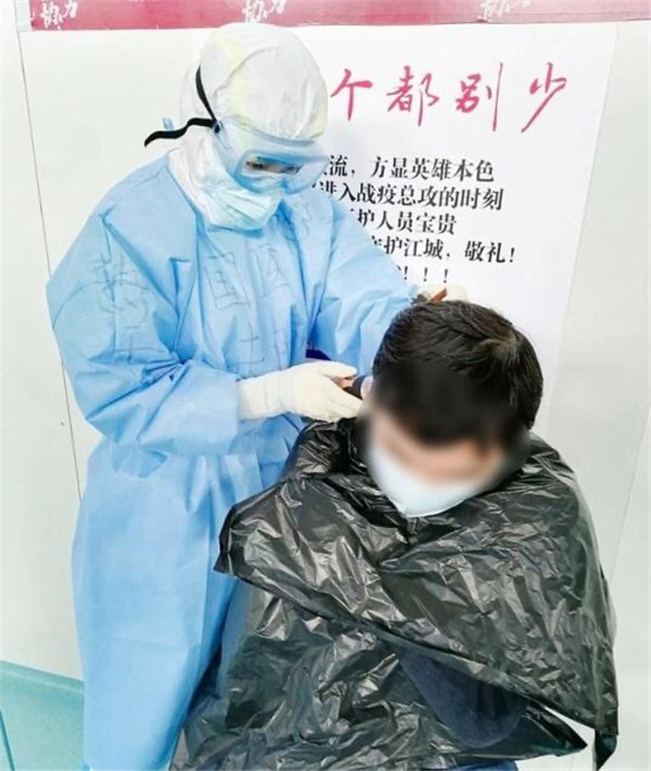 1艙有康復(fù)人員想理發(fā),手頭沒有工具,朱晴護(hù)士長得知后,聯(lián)系下個(gè)班次護(hù)士帶來推子,給大家理發(fā)。“看你動(dòng)作很嫻熟啊,以前練過的吧”,“圍觀群眾”打趣道。“現(xiàn)學(xué)現(xiàn)賣,大家要求不要太高,有壓力??!”朱晴說。一直推到推子沒電,朱晴給6位康復(fù)人員簡單修剪了頭發(fā)。得知朱晴是西安醫(yī)療隊(duì)的護(hù)士,大家都親切的稱她“肉夾饃”!