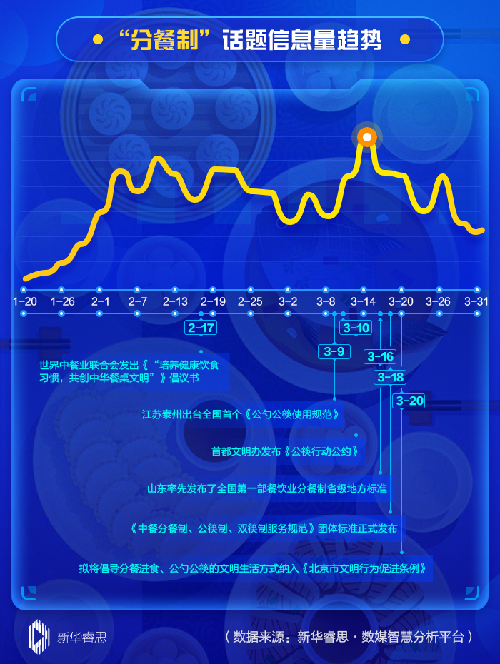 根據(jù)新華睿思·數(shù)媒智慧分析平臺(tái)數(shù)據(jù)顯示,在最近兩個(gè)月來,關(guān)于分餐制話題的關(guān)注度不斷上升,全國范圍內(nèi)信息量累計(jì)達(dá)到1039539條。其中,從話題趨勢演變圖看,3月14日達(dá)到輿論熱度的首個(gè)峰值(30183條),這與北京、江蘇泰州等地發(fā)布出臺(tái)關(guān)于公筷使用的文件直接相關(guān)。