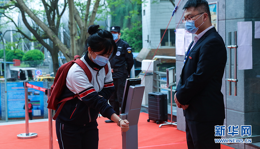 在重慶市第一中學,大校門設置了多條紅外線成像體溫測控通道,能夠快速檢測到師生體溫并清楚顯示。學生從通道經(jīng)過時,紅外線測溫儀會及時監(jiān)測通過者體溫,若有體溫異常者,設備會報警。圖為學校老師演習進校場景。新華網(wǎng)發(fā)