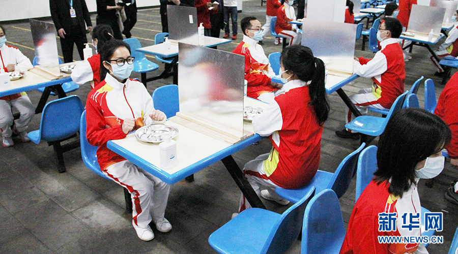 為了防止在就餐時交叉感染,重慶許多學校都對食堂設施進行了相應改造——譬如在就餐位上安裝隔板,以做到錯時錯峰分散用餐。圖為兩江育才中學演練食堂就餐環(huán)節(jié)。新華網(wǎng)發(fā)