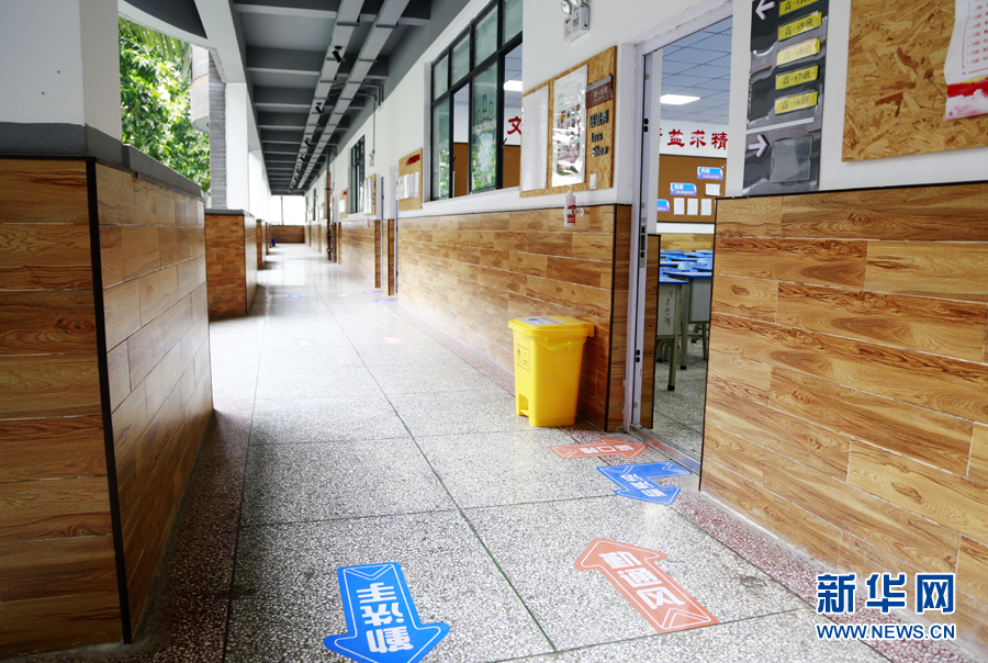 在重慶市第十一中學,為避免人流聚集,在公眾通道處學校設置了行進方向指示標識以引導師生。新華網(wǎng) 彭博攝