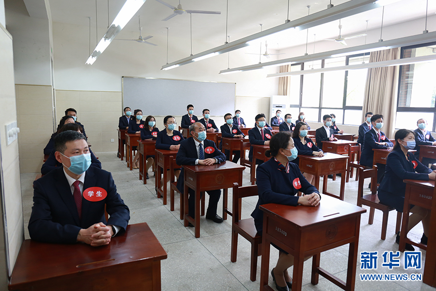 在重慶市第一中學,學生返校時須由值班人員引導指揮,在校門外有序排隊,相互間保持一米的距離,并從專用通道依次有序進入。圖為學校老師演習進校場景。新華網(wǎng)發(fā)
