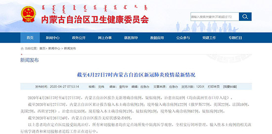 截至2020年4月26日24時,內(nèi)蒙古自治區(qū)報告無癥狀感染者0例。