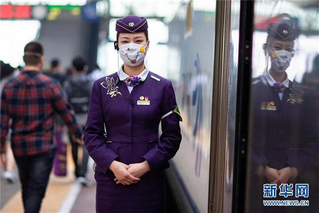 5月8日,在南京火車站站臺上,一名列車員戴著“笑臉口罩”迎接旅客上車。 當日是世界微笑日。 新華社發(fā)(蘇陽 攝)