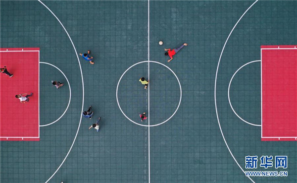 在廣西融水苗族自治縣桿洞鄉(xiāng)黨鳩小學(xué),學(xué)生們?cè)谛虑驁?chǎng)上踢球(5月13日攝,無人機(jī)照片)。新華社記者黃孝邦攝