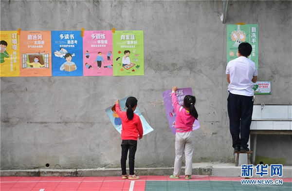 在廣西融水苗族自治縣桿洞鄉(xiāng)黨鳩小學(xué),師生們?cè)谛@里張貼海報(bào)(5月13日攝)。新華社記者黃孝邦攝
