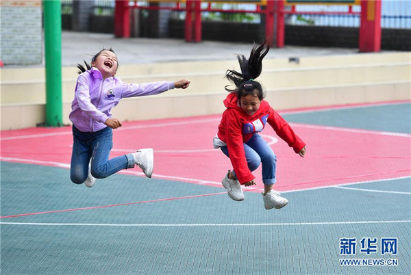 在廣西融水苗族自治縣桿洞鄉(xiāng)黨鳩小學(xué),學(xué)生在新球場(chǎng)上跳繩(5月13日攝)。新華社記者黃孝邦攝