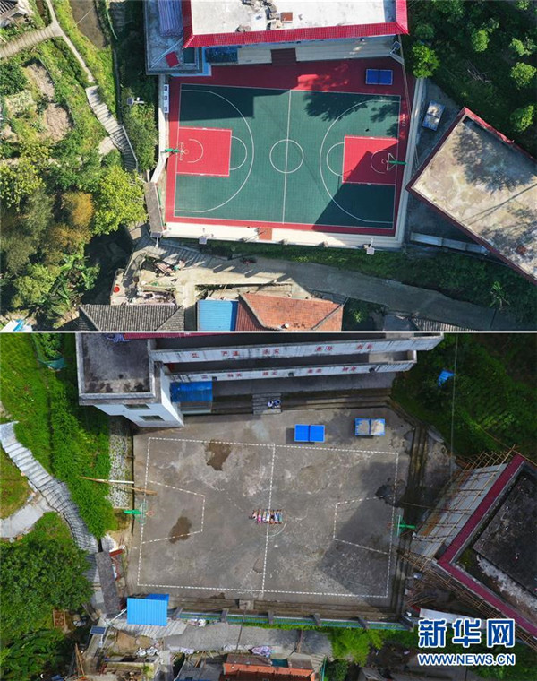 這張拼版照片的上圖為完成改造后的黨鳩小學(xué)塑膠球場(chǎng)(2020年4月15日攝,無人機(jī)照片);下圖為黨鳩小學(xué)改造前的球場(chǎng)(2019年7月5日攝,無人機(jī)照片)。新華社記者黃孝邦攝