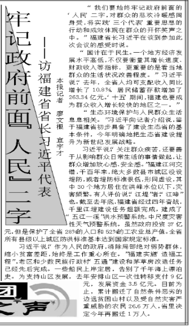 “我們要始終牢記政府前面的‘人民’二字,對群眾的悲歡冷暖感同身受。”2002年3月4日,人民日報兩會特刊的“代表團(tuán)之聲”欄目里,刊發(fā)了對時任福建省省長的習(xí)近平代表的采訪,標(biāo)題是《牢記政府前面“人民”二字》。