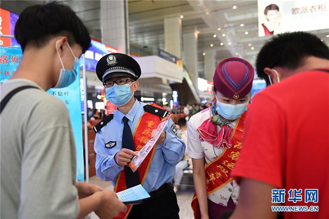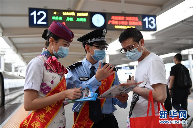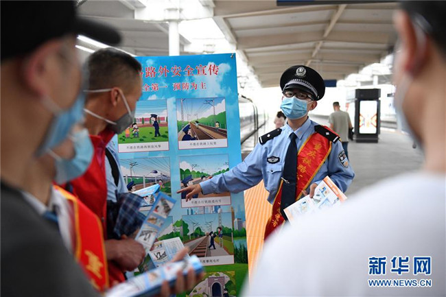 5月25日,在重慶北站北廣場站臺,鐵路工作人員向旅客宣講鐵路安全知識和疫情防控知識。 新華社記者 唐奕 攝