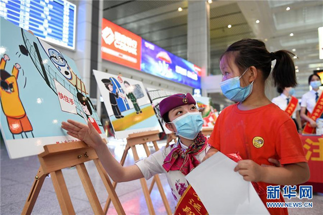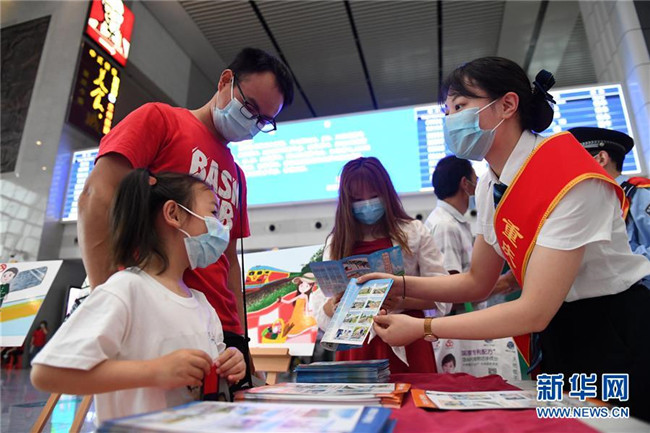 5月25日,在重慶北站北廣場候車廳,鐵路工作人員向小朋友宣講鐵路安全知識和疫情防控知識。新華社記者 唐奕 攝