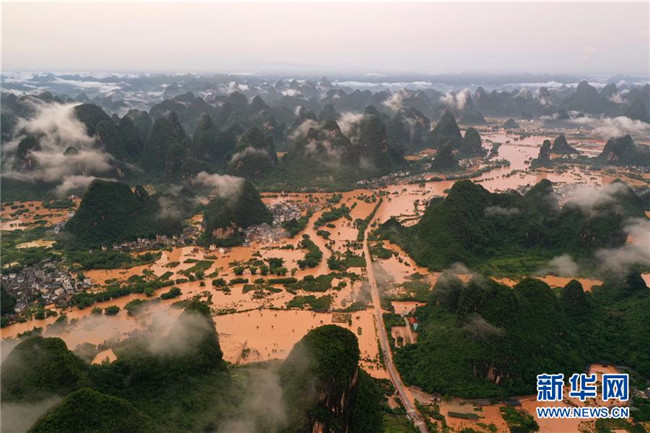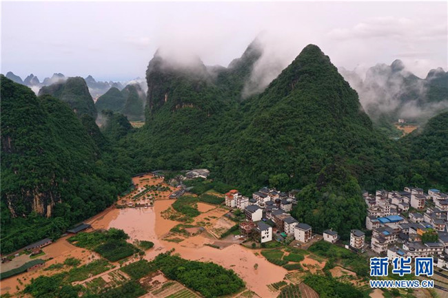 這是廣西陽朔縣部分出現(xiàn)嚴重積水的村莊(6月7日攝,無人機照片)。 新華社記者 陸波岸 攝