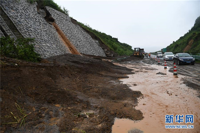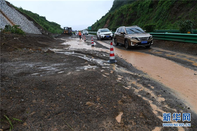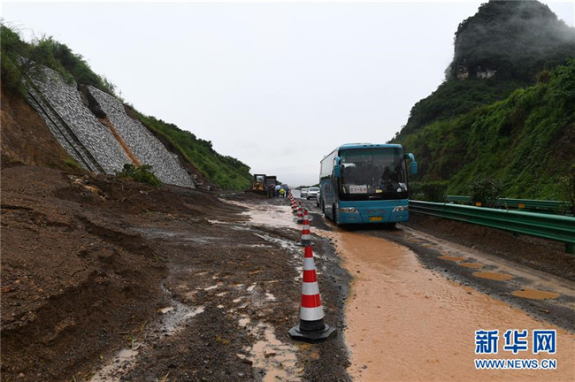 6月7日,在廣西鹿寨至陽朔的高速公路上,車輛從一處發(fā)生滑坡的路段經(jīng)過。新華社記者 陸波岸 攝