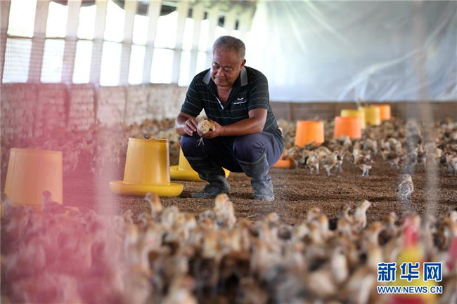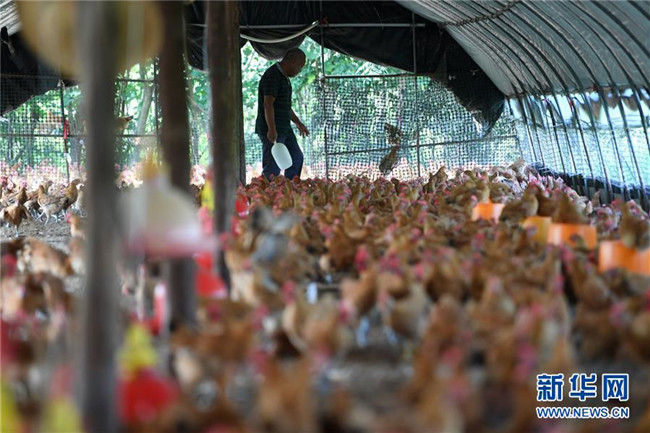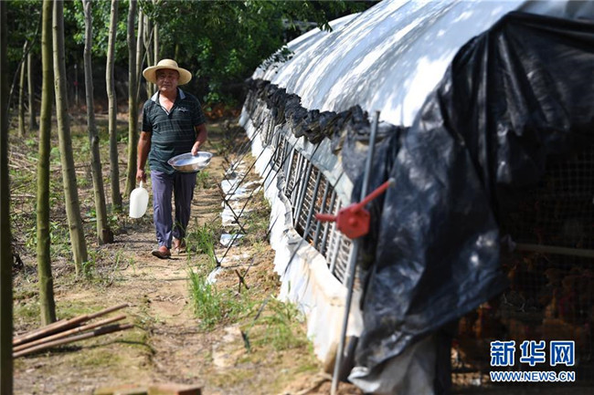 6月26日,在肥西縣花崗鎮(zhèn)楊灣村的土雞養(yǎng)殖基地里,黃榮春在查看土雞長(zhǎng)勢(shì)。新華社記者 劉軍喜 攝