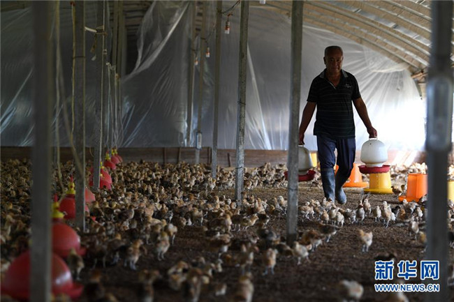 6月26日,在肥西縣花崗鎮(zhèn)楊灣村的土雞養(yǎng)殖基地里,黃榮春在雞棚里忙碌。新華社記者 劉軍喜 攝