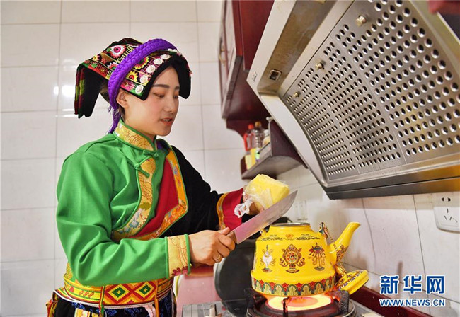6月11日,四川省阿壩藏族羌族自治州理縣古爾溝鎮(zhèn)丘地村村民哈姆斯基為游客熬制酥油茶。新華社記者 劉坤 攝