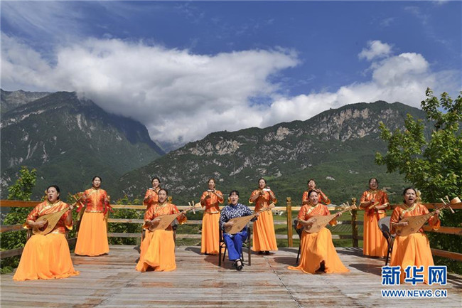 四川省阿壩藏族羌族自治州阿壩縣“蓮寶葉則”演藝公司演職人員在表演傳統(tǒng)曲種《折嘎》(6月14日攝)。折嘎是古老的曲種,如今被搬上舞臺(tái),并在演唱中加入了傳遞吉祥、贊頌新人新事新風(fēng)尚的內(nèi)容。這些演職人員中不少是從當(dāng)?shù)剜l(xiāng)村里來(lái)的年輕人,經(jīng)過(guò)培訓(xùn)合格后成為演員,通過(guò)表演獲得穩(wěn)定的收入。新華社記者 沈伯韓 攝