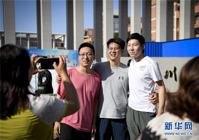 7月8日,在重慶市徐悲鴻中學考點,考生在考試結束后在校門口合影。 當日,全國部分地區(qū)2020年高考結束。 新華社記者 唐奕 攝