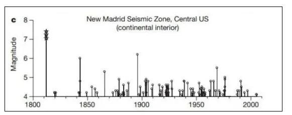例如,在1811-1812年間,位于北美板塊內部的美國密蘇里州的紐馬德里地區(qū)曾發(fā)生過三次7.0-7.4級地震。盡管地震已經(jīng)過去兩百多年,但一直到2000年為止,該地區(qū)的小震依然很活躍,研究人員認為這些小震是大地震的余震。