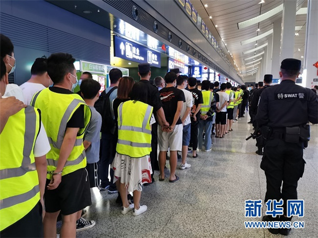 7月11日19時,在位于蘭州市區(qū)的蘭州西站,137名犯罪嫌疑人在警方押解下走下列車,這僅是蘭州警方破獲的一起特大電信網(wǎng)絡詐騙案的部分犯罪嫌疑人。由于犯罪嫌疑人較多,警方調(diào)派多輛大巴車在火車站等候押送。