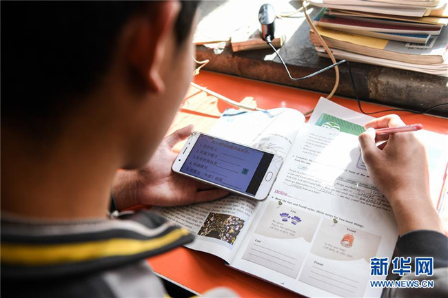 內(nèi)蒙古準(zhǔn)格爾旗龍口鎮(zhèn)紅樹梁村的初一學(xué)生劉進才在家中上網(wǎng)課(3月10日攝)。新華社記者 劉磊 攝