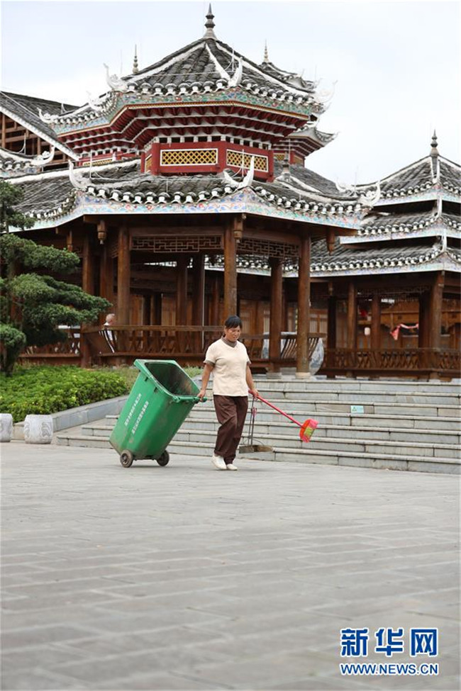 7月19日,在貴州省銅仁市玉屏侗族自治縣田坪鎮(zhèn)侗鄉(xiāng)風(fēng)情園內(nèi),易地扶貧搬遷群眾在清掃環(huán)境衛(wèi)生。新華社發(fā)(胡攀學(xué) 攝)