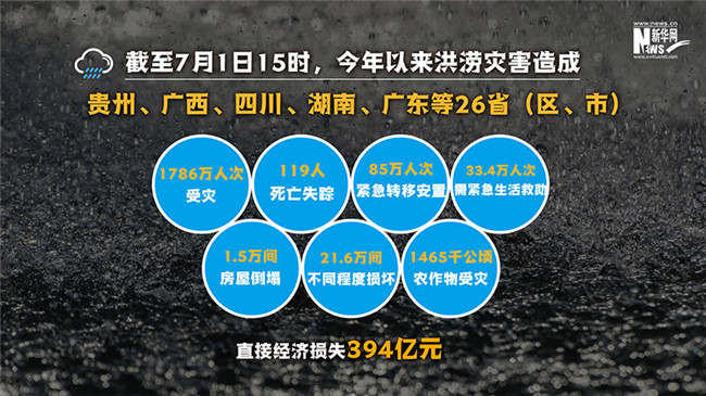 今年汛情帶來的破壞力有多強?張家團告訴記者,截至7月1日15時,今年以來洪澇災(zāi)害造成貴州、廣西、四川、湖南、廣東等26?。▍^(qū)、市)1786萬人次受災(zāi),119人死亡失蹤,85萬人次緊急轉(zhuǎn)移安置,33.4萬人次需緊急生活救助;1.5萬間房屋倒塌,21.6萬間不同程度損壞;農(nóng)作物受災(zāi)面積1465千公頃,其中絕收150千公頃;直接經(jīng)濟損失394億元。