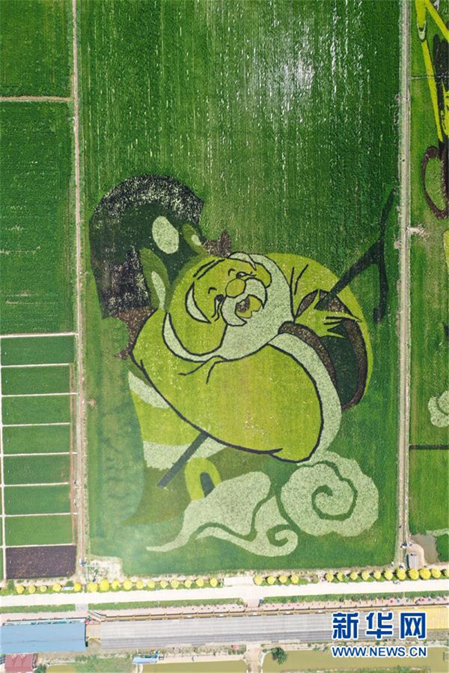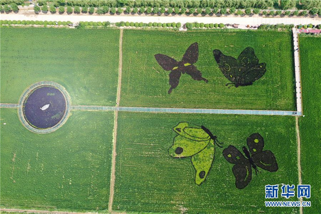這是寧夏賀蘭縣稻漁空間鄉(xiāng)村生態(tài)觀光園內(nèi)的稻田畫(7月22日攝,無人機(jī)照片)。新華社記者 劉海 攝