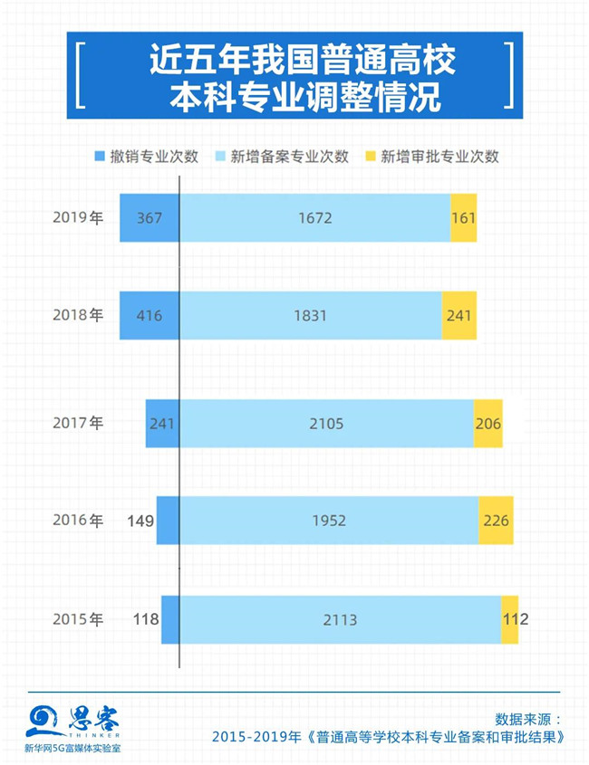 4近五年我國(guó)普通高校本科專業(yè)調(diào)整情況       近年來(lái),隨著經(jīng)濟(jì)社會(huì)的不斷發(fā)展,高校的專業(yè)設(shè)置也在不斷更迭,可供選擇的專業(yè)也越來(lái)越多。2015年開(kāi)始,全國(guó)高校每年增設(shè)專業(yè)數(shù)量在2000個(gè)左右,撤銷專業(yè)的數(shù)量也超過(guò)100個(gè)。