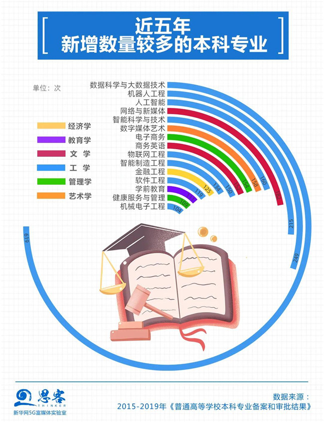 工學(xué)新增專業(yè)數(shù)量遙遙領(lǐng)先。數(shù)據(jù)顯示,近五年新增數(shù)量較多的數(shù)據(jù)科學(xué)與大數(shù)據(jù)技術(shù)、機(jī)器人工程和人工智能等專業(yè)都屬于工學(xué)。這些專業(yè)也是特設(shè)專業(yè)(專業(yè)代碼后加T表示),根據(jù)高校的辦學(xué)特色或者是近幾年來(lái)人才的培養(yǎng)特殊需求設(shè)置。與每五年調(diào)整一次的基本專業(yè)不同,特設(shè)專業(yè)可以每年調(diào)整一次,兩種特性的專業(yè)可以分別管理。