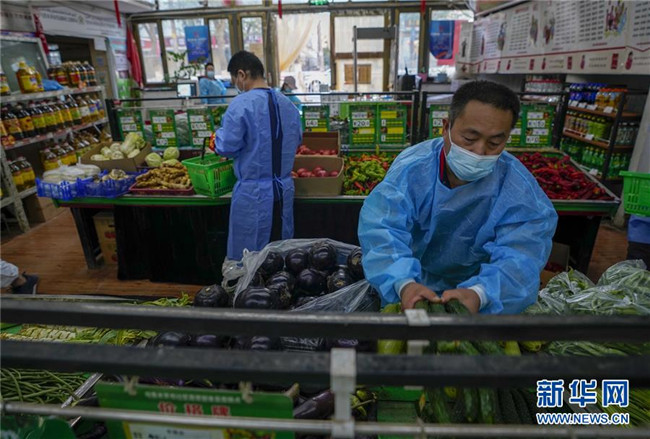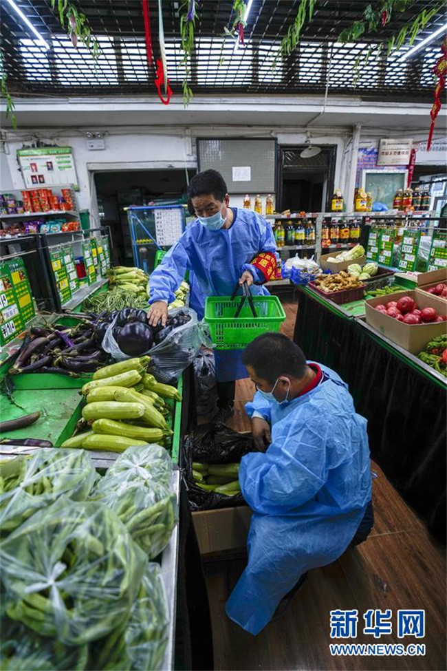 在烏魯木齊市沙依巴克區(qū)揚(yáng)子江街道青松苑社區(qū)蔬菜直銷(xiāo)點(diǎn),陳金奇(前)幫助為小區(qū)居民采買(mǎi)的志愿者按照網(wǎng)絡(luò)訂單挑選蔬菜(8月8日攝)。新華社記者 趙戈 攝