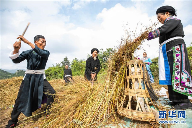 8月15日,村民在貴州省畢節(jié)市赫章縣珠市彝族鄉(xiāng)以那村采收成熟的苦蕎。新華社發(fā)(羅大富 攝)