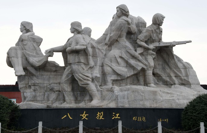 她們是東北抗日聯(lián)軍第5軍婦女團的政治指導員冷云,班長胡秀芝、楊貴珍,戰(zhàn)士郭桂琴、黃桂清、王惠民、李鳳善和被服廠廠長安順福。1938年10月,該部在牡丹江地區(qū)烏斯渾河渡口與日偽軍千余人遭遇。已行至河邊準備渡河的婦女團8名成員,為掩護大部隊突圍,毅然放棄渡河,在冷云率領下,分成3個戰(zhàn)斗小組,與日偽軍展開激戰(zhàn)。她們主動吸引日偽軍火力,使部隊主力得以迅速擺脫敵人的攻擊,但她們卻被敵人圍困于河邊。在背水作戰(zhàn)至彈盡的情況下,面對日偽軍逼降,女戰(zhàn)士們誓死不屈。她們毀掉槍支,挽臂涉入烏斯渾河,高唱著《國際歌》,集體沉江,壯烈殉國。犧牲時,她們年齡最大的冷云23歲,最小的王惠民才13歲。
