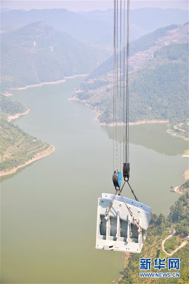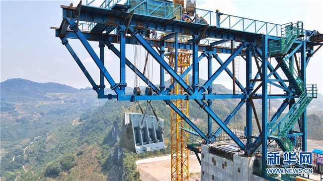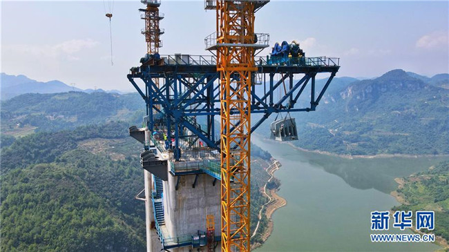 9月1日,工作人員在對主索鞍進(jìn)行吊裝(無人機(jī)照片)。新華社記者劉續(xù)攝