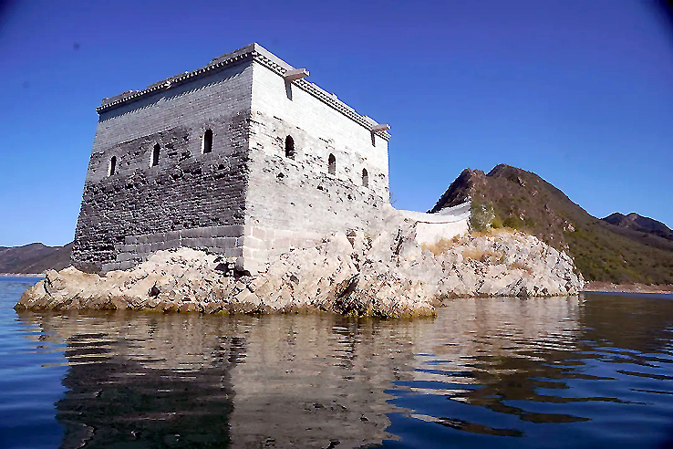 潘家口水庫(kù)“水下長(zhǎng)城”,一船只從城墻邊駛過(攝于2012年)。新華社發(fā)(朱建軍 攝)