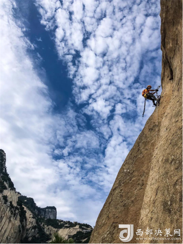 自然巖壁結組攀登源自軍事特戰(zhàn)項目,它就像是巖壁上的“馬拉松”,攀登大巖壁路線,攀巖隊伍需要使用吊帳和拖包等更多安全裝備完成多日攀登。從最基礎的攀登動作練習,到完成近千米的大巖壁攀登,這不僅將考驗運動員們的攀巖技術,還要挑戰(zhàn)他們在巖壁上的生存能力。此次自然巖壁結組攀登的巖壁甄選白云峰,其位于華山北峰云臺峰之北,石白如雪,一年四季白云繚繞,隨云飄浮而升降起伏,如海中的大魚隨浪翻滾,極其壯觀,而攀巖隊員們此次就需要在這600多米高的巖壁線路上生活至少2天。