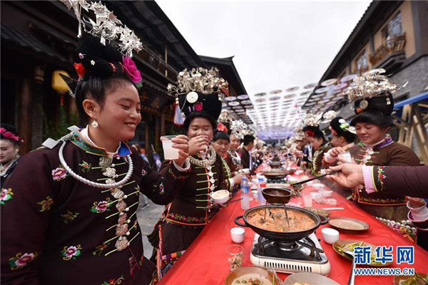 10月18日,苗族群眾在貴州省丹寨縣萬(wàn)達(dá)小鎮(zhèn)吃新節(jié)長(zhǎng)桌宴上品嘗佳肴。當(dāng)日,貴州省黔東南苗族侗族自治州丹寨縣萬(wàn)達(dá)小鎮(zhèn)舉辦苗族吃新節(jié)體驗(yàn)活動(dòng)。當(dāng)?shù)孛缱逋J笙舞、品長(zhǎng)桌宴,并邀請(qǐng)游客參與其中,大家在歡聲笑語(yǔ)中樂(lè)享金秋。新華社發(fā)(唐樹(shù)軍攝)