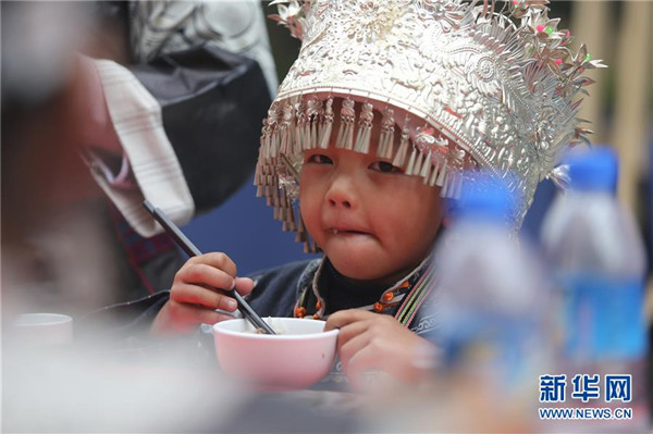 10月18日,一名小朋友在貴州省丹寨縣萬(wàn)達(dá)小鎮(zhèn)吃新節(jié)長(zhǎng)桌宴上品嘗佳肴。當(dāng)日,貴州省黔東南苗族侗族自治州丹寨縣萬(wàn)達(dá)小鎮(zhèn)舉辦苗族吃新節(jié)體驗(yàn)活動(dòng)。當(dāng)?shù)孛缱逋J笙舞、品長(zhǎng)桌宴,并邀請(qǐng)游客參與其中,大家在歡聲笑語(yǔ)中樂(lè)享金秋。新華社發(fā)(張暉攝)
