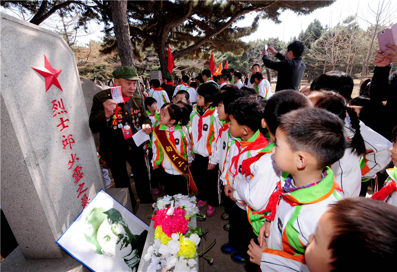 在沈陽(yáng)抗美援朝烈士陵園,志愿軍老戰(zhàn)士李維波(左一)向?qū)W生們講述邱少云的英雄事跡(2014年4月3日攝)。新華社發(fā)(張文魁攝)