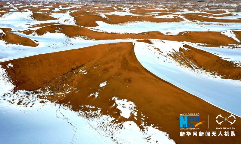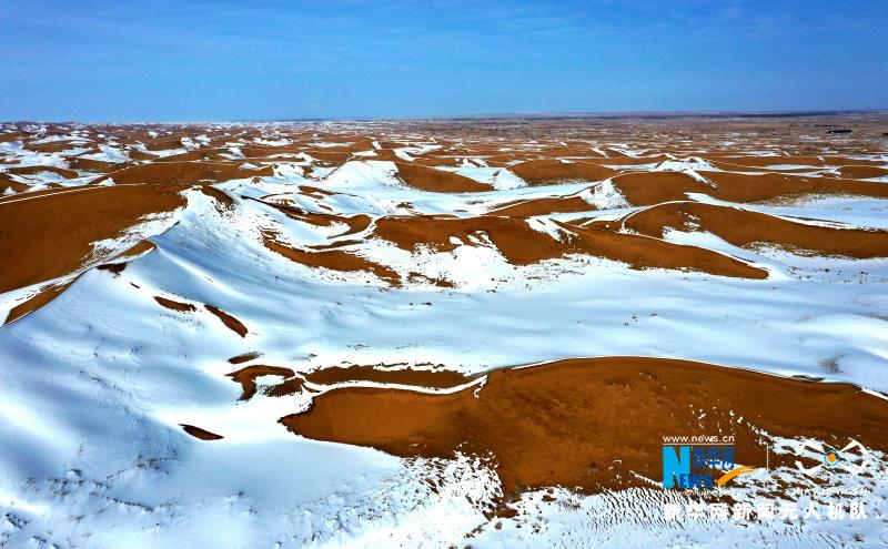 近日,一場降雪將甘肅省武威市民勤縣境內(nèi)的騰格里沙漠裝扮得分外妖嬈,黃沙白雪相互交融,宛如一幅壯美畫卷在天地間鋪展。新華網(wǎng)發(fā)(馬愛彬 攝)