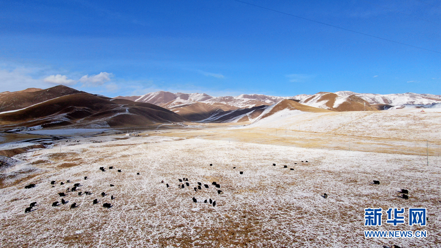 12月6日,牦牛在雪后的阿柔草原上活動(無人機照片)。新華社記者 張宏祥 攝