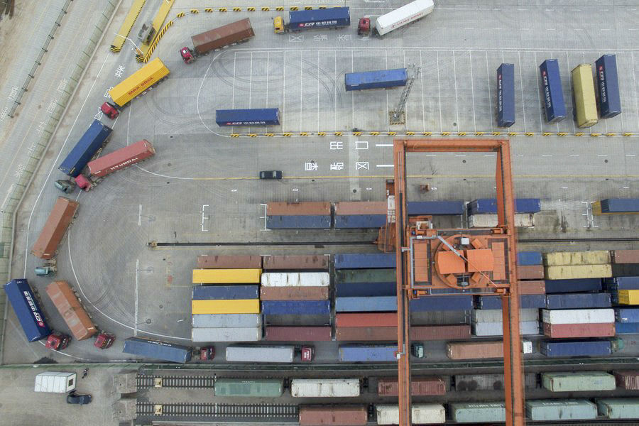 2016年12月28日,在浙江義烏火車西站,裝有中國出口商品集裝箱的貨車排隊(duì)進(jìn)入一列中歐班列的裝卸區(qū)。 新華社記者 黃宗治攝