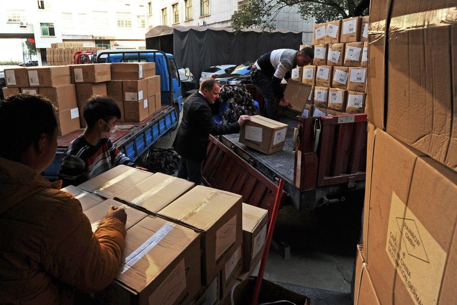 2019年11月28日,英國人奈杰爾(右二)在公司倉庫查驗(yàn)一批出口貨物。 2005年初,奈杰爾來到浙江省義烏市國際商貿(mào)城,為這里的經(jīng)營戶培訓(xùn)英語。2014年11月以來,中歐班列(義烏)相繼開通了11條線路。自此,奈杰爾的進(jìn)出口生意也有了新通道。新華社記者 譚進(jìn) 攝