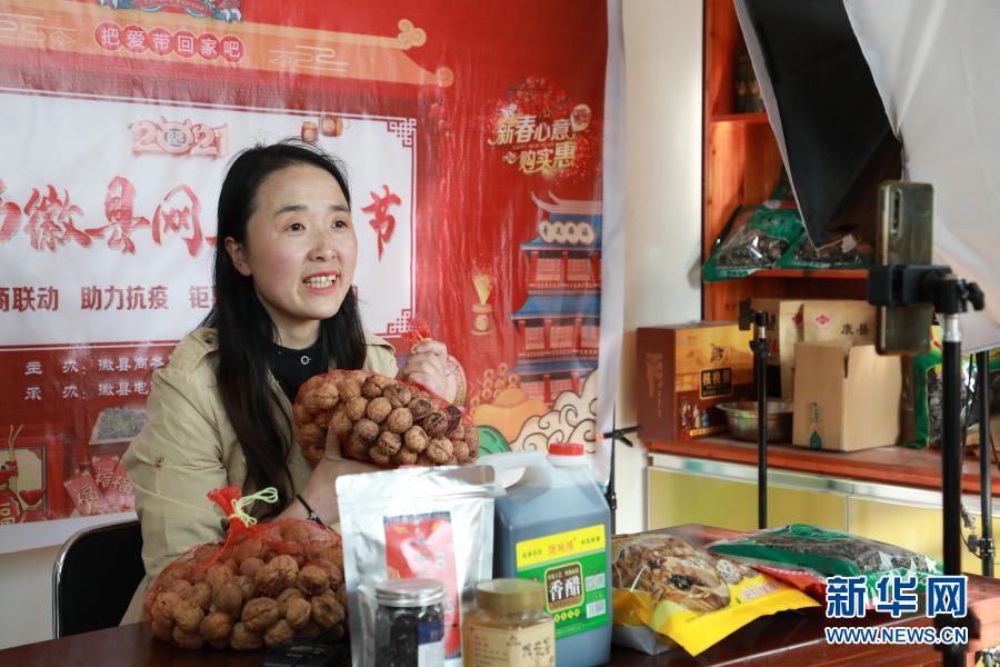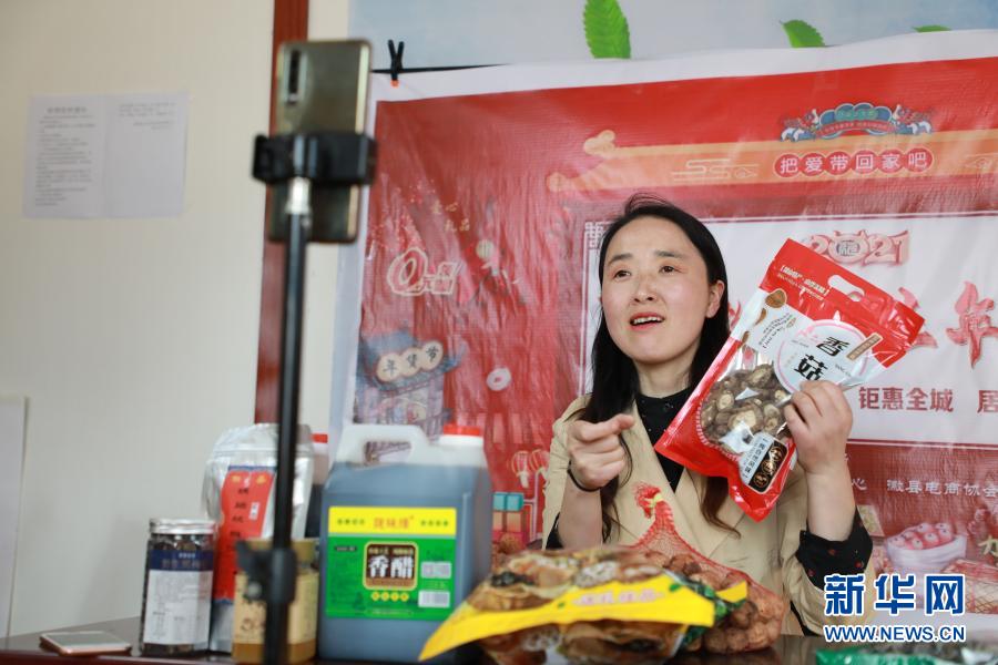2月23日,在位于甘肅隴南市徽縣的店鋪中,全國(guó)人大代表梁倩娟在網(wǎng)上直播銷售當(dāng)?shù)剞r(nóng)特產(chǎn)品。新華社記者 張智敏 攝